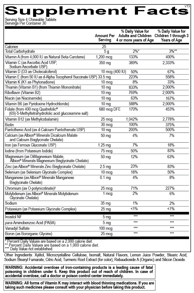 Chew 2-4 tablets of Multi Daily Junior daily, or as directed by your healthcare provider, for optimal nutritional support.
